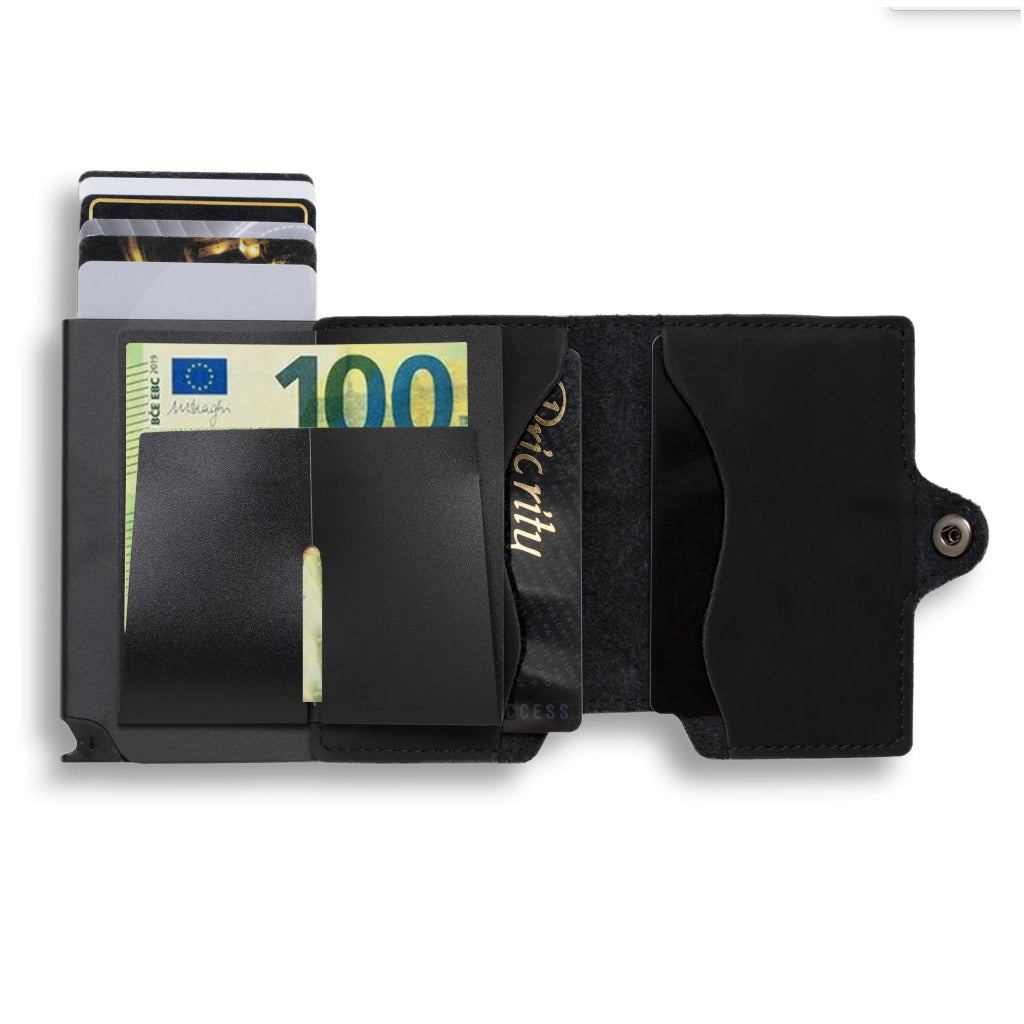 Masszív bőr és fém belseje megvédi a kártyáit az elhajlástól és az esetleges megtöréstől is, valamint az RFID kártyák jogosulatlan beolvasásától.