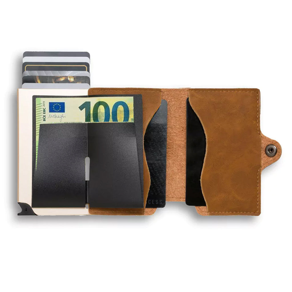 Masszív bőr és fém belseje megvédi a kártyáit az elhajlástól és az esetleges megtöréstől is, valamint az RFID kártyák jogosulatlan beolvasásától.